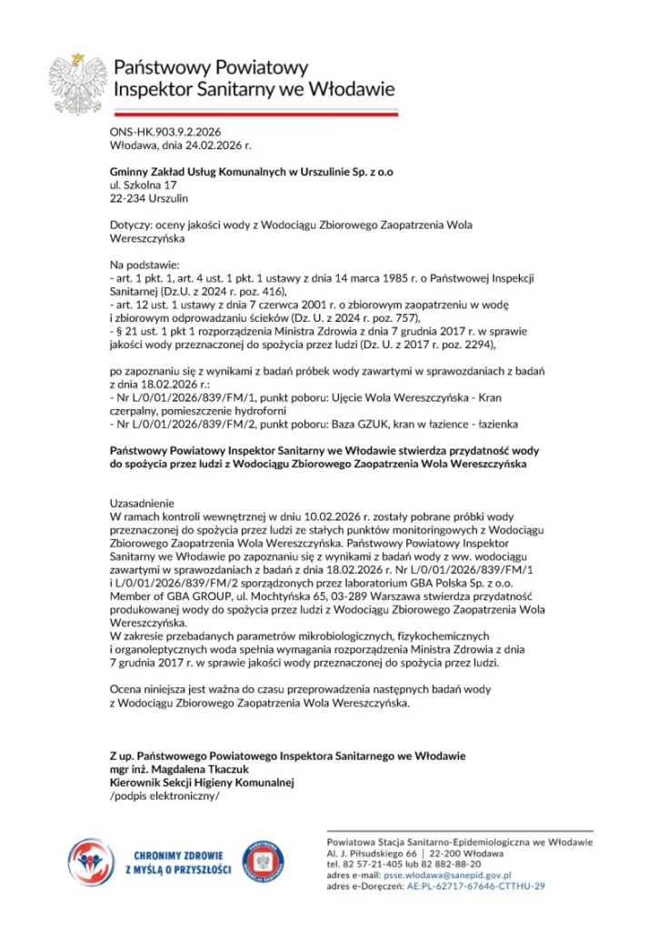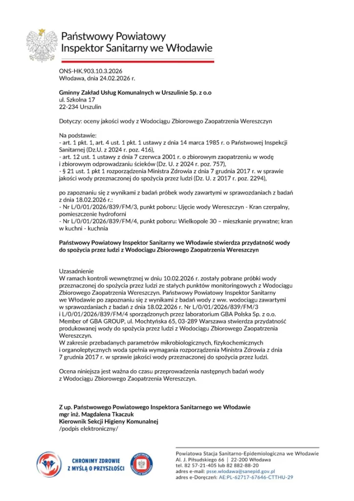 Oceny jakości wody przeznaczonej do spożycia z Wodociągu Zbiorowego Zaopatrzenia Wereszczyn oraz Wola Wereszczyńska